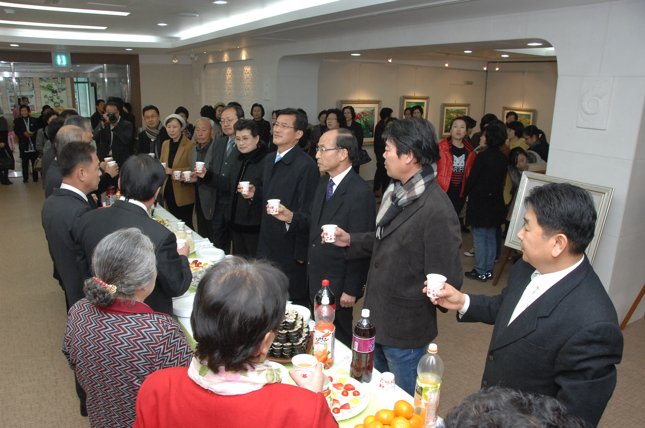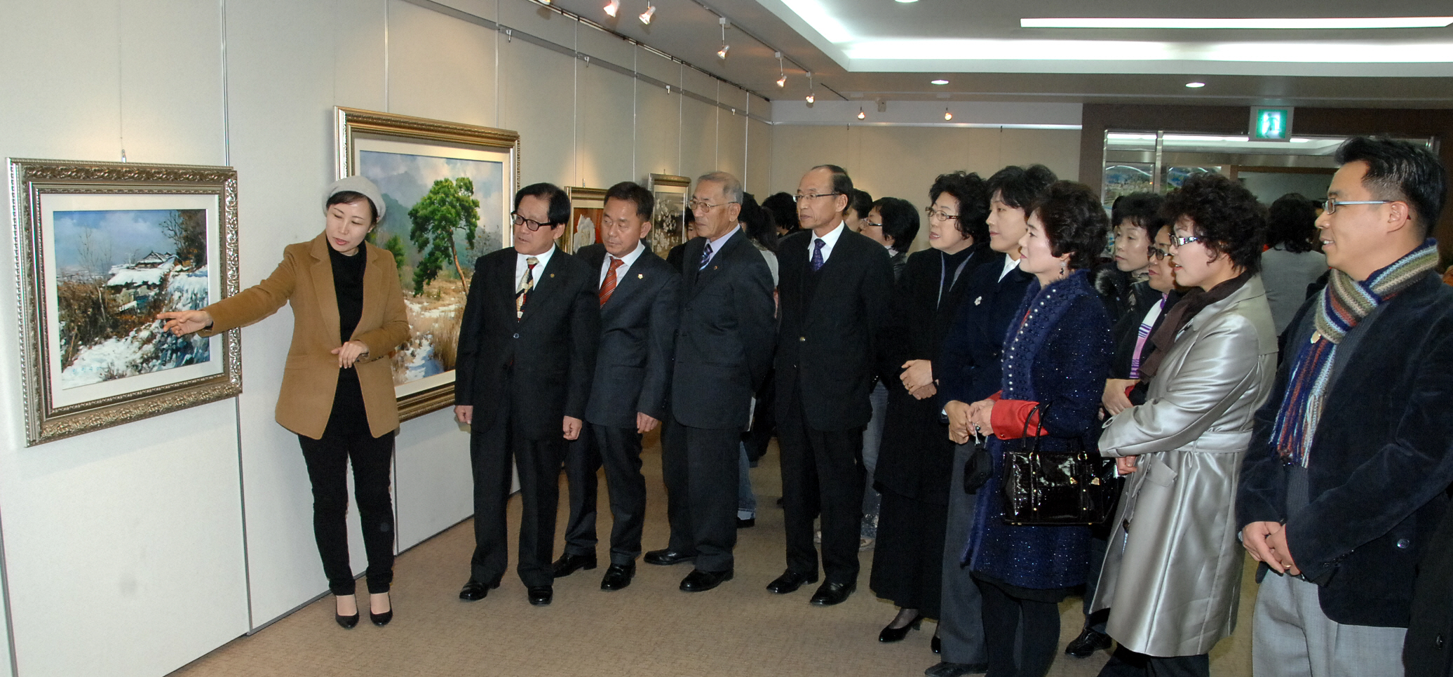 증평군 증평읍 장동 문화원 1층 보강천 갤러리에서는 향토작가 이민숙씨의 작품전시회가 오는 12월 6일까지 열린다. 사진은 이민숙씨가(사진 왼쪽과 오른쪽 끝에 모자쓴 사람) 작품을 설명하고 있는 모습 [보도자료실 참조]