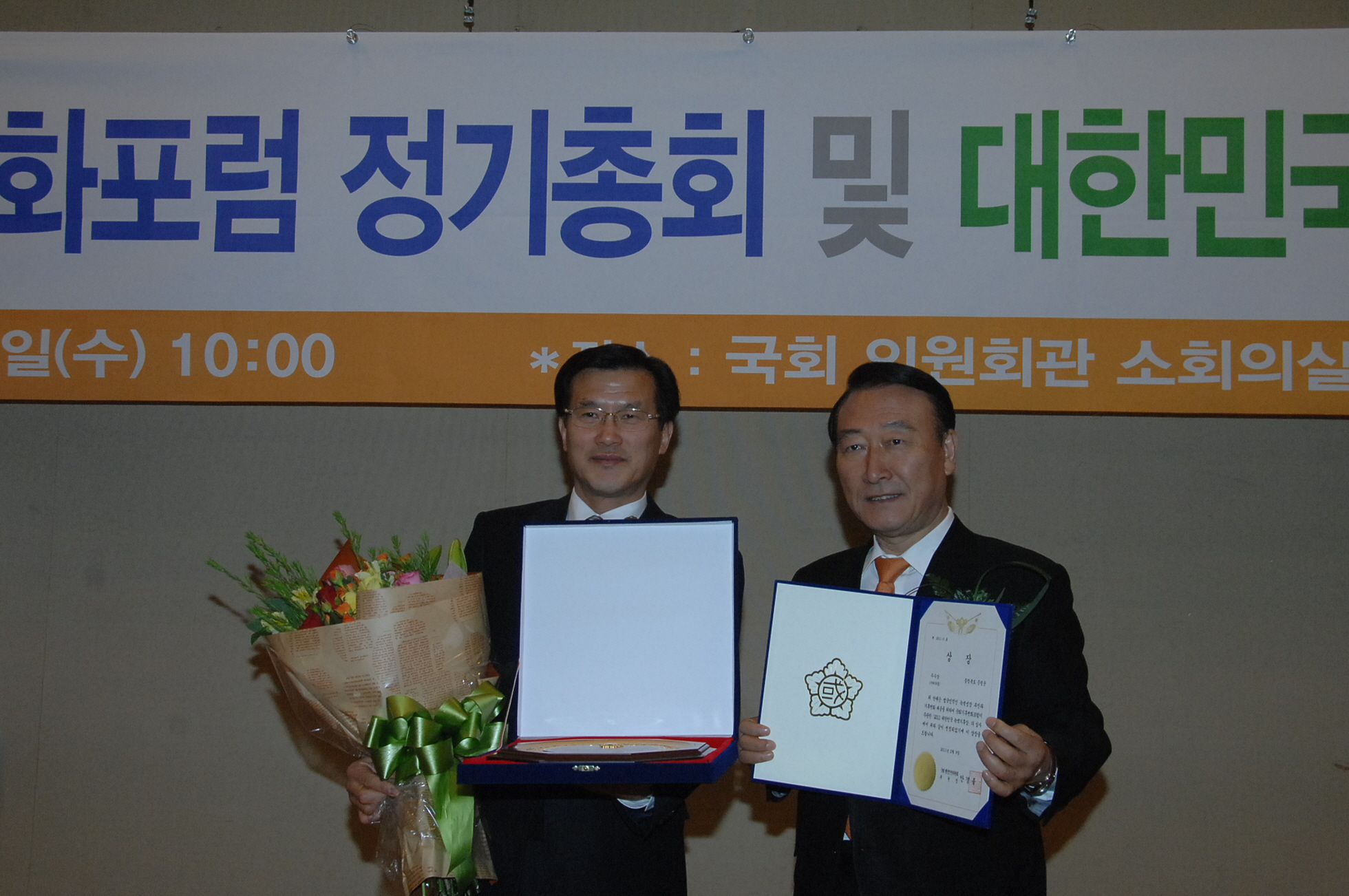 증평군이 9일 국회 의원회관에서 열린 “2011 대한민국 녹색기후상” 시상식에서 자치단체 부문 우수상을 수상했다. 사진은 안경률 국회행정안전위원장(사진오른쪽)이 홍성열 증평군수에게 상장을 수여하는 모습 [증평포커스 참조]