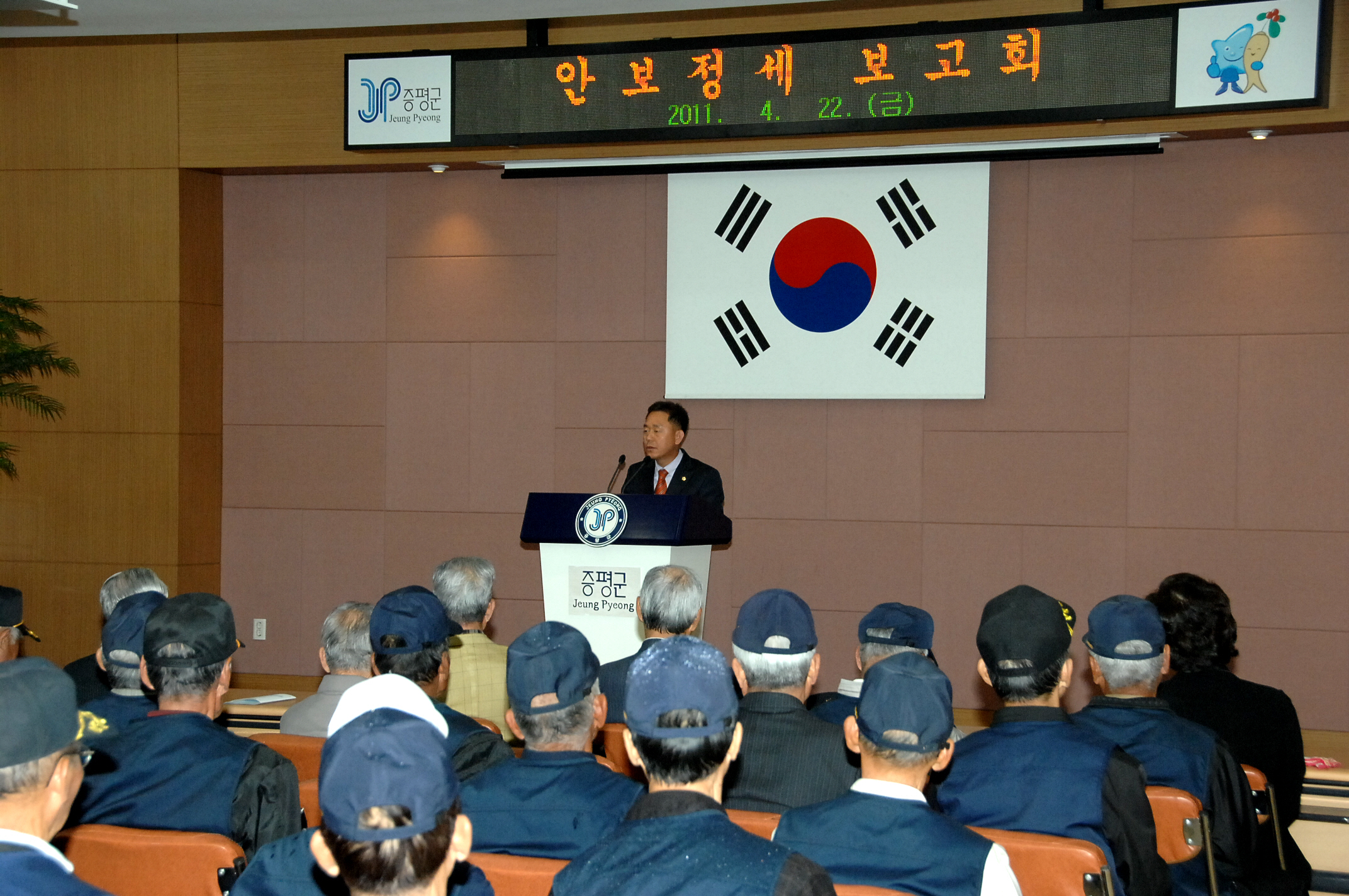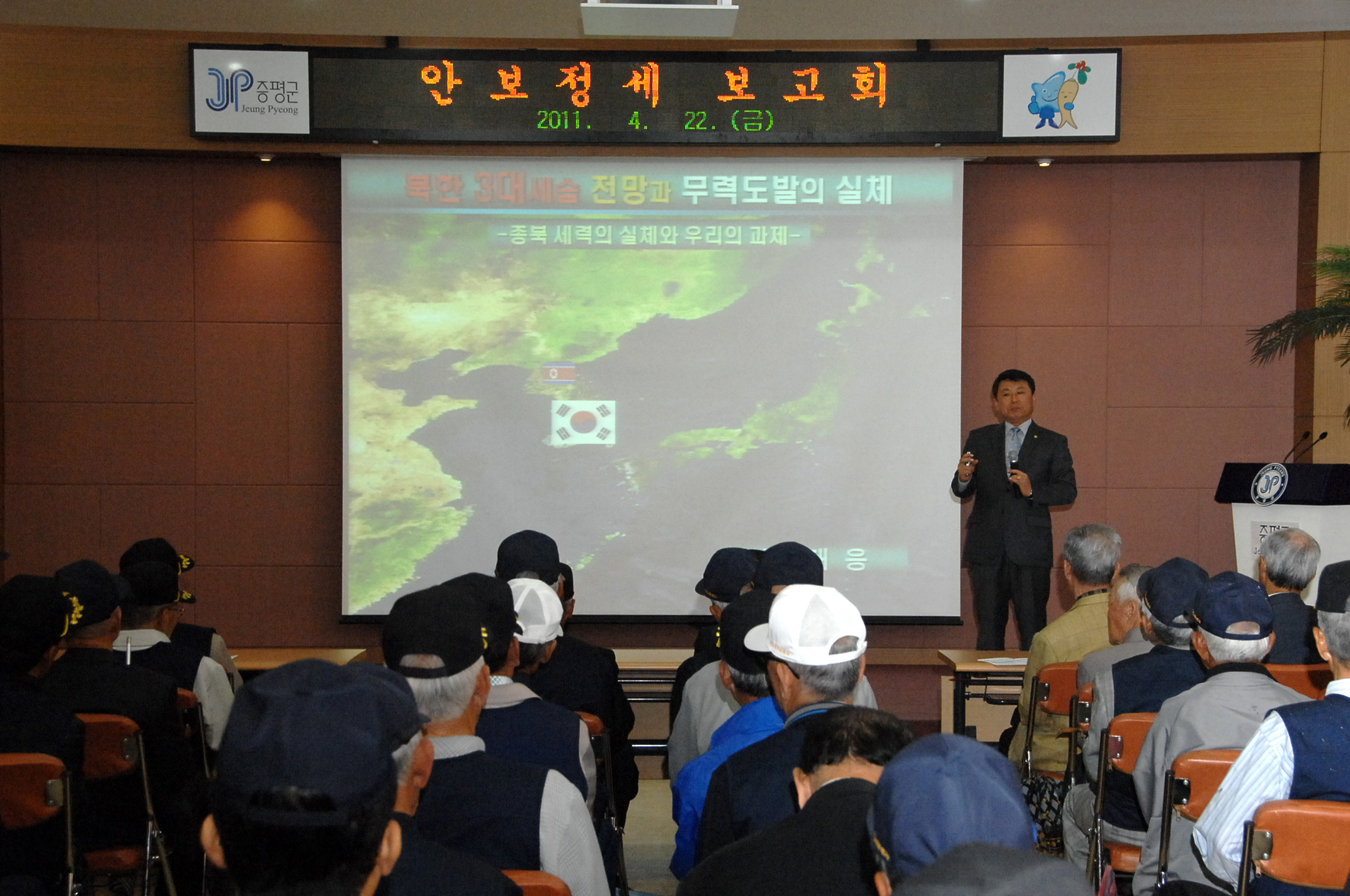 증평군보훈단체협의회(회장 남대순)는 22일 오전 10시30분 증평군청 2층 대회의실에서 홍설열군수, 김재룡군의장을 비롯한 군의원, 충주보훈지청 정하택 보훈과장, 협의회원 등 100여명이 참석한 가운데 충북도 재향군인회 허태웅 안보부장을 초빙하여 ‘한반도 정세와 국가안보’에 대한 강연회를 가졌다.