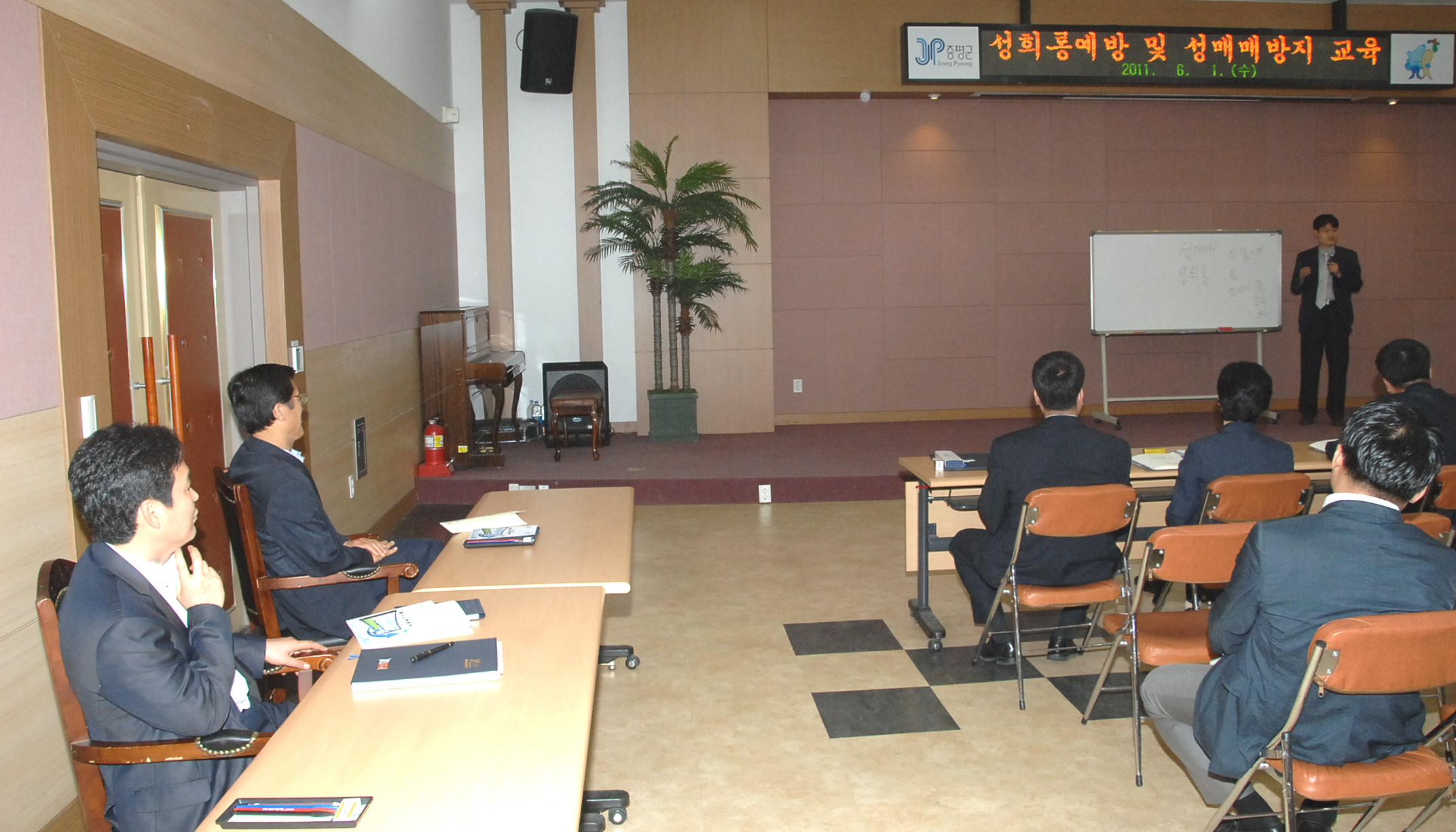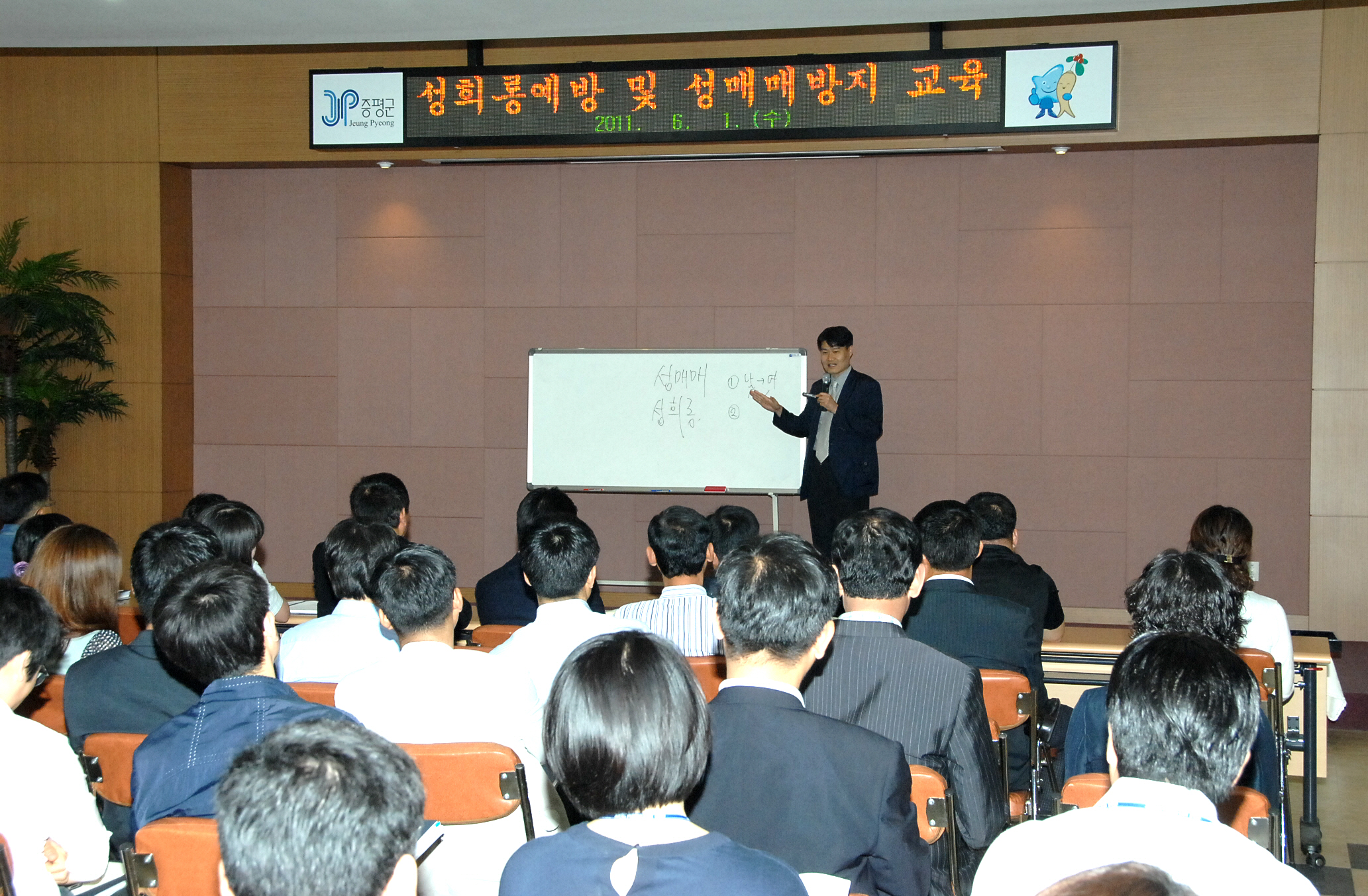 증평군은 1일 군청 대회의실에서 한국양성평등교육진흥원 염건령 교수을 초빙하여 직원 300여명을 대상으로 “직장 내 성희롱 예방과 성매매 방지 및 처벌에 관한 법령교육”을 실시했다. [보도자료실 참조]