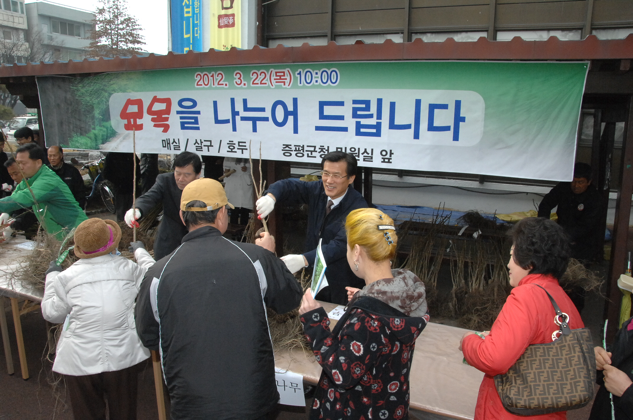 증평군은 봄철 나무심기로 저탄소 녹색성장 분위기를 확산시키기 위해 22일 오전 10시 군청 민원실 앞에서 나무 나누기 행사를 전개했다. [보도자료실 참조]