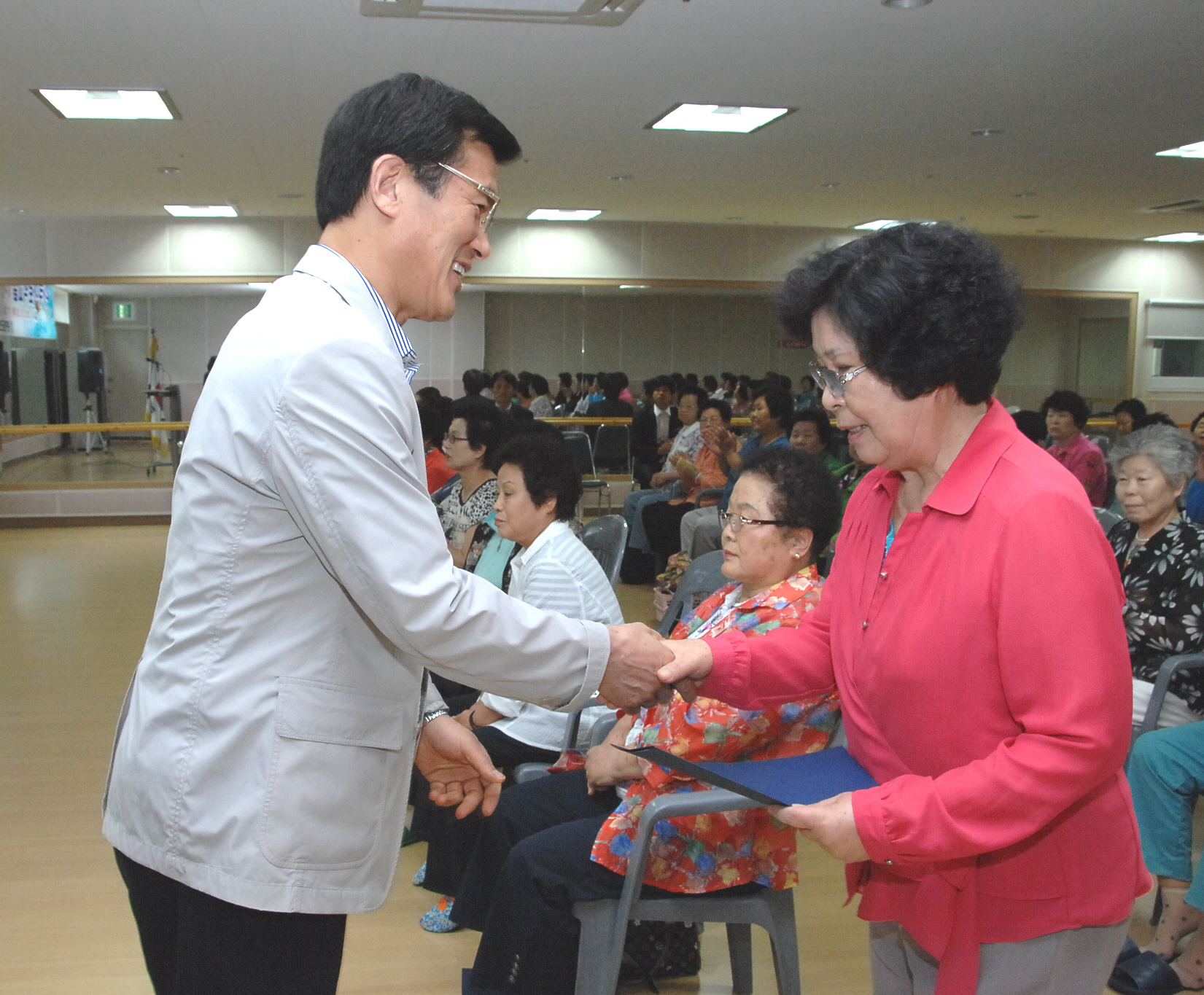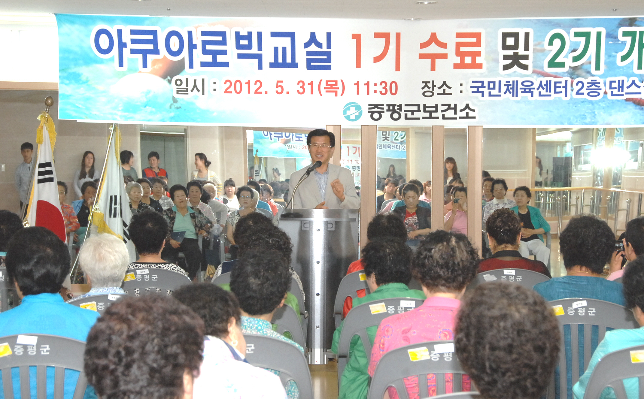 증평군보건소는 31일 오전 11시 증평국민체육센터 2층 댄스실에서 수강자 등 관계자 80여명이 참석한 가운데 1기 아쿠아로빅 수영교실 수료식 및 제2기 개강식을 실시했다.[보도자료실 참조]
