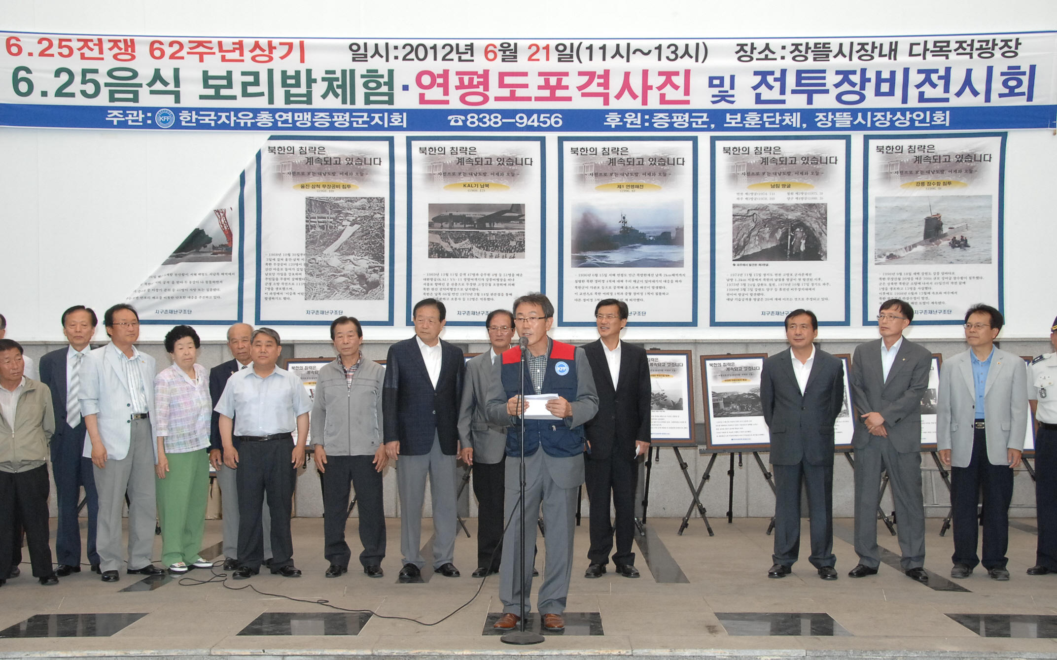 6·25 전쟁 62주년 및 호국보훈의 달 6월을 맞아 한국자유총연맹증평군지회(지회장 김덕중)는 21일 오전 11시부터 증평장뜰시장 다목적광장에서 6·25 음식체험 및 사진·전투장비전시회를 개최했다. [보도자료실 참조]