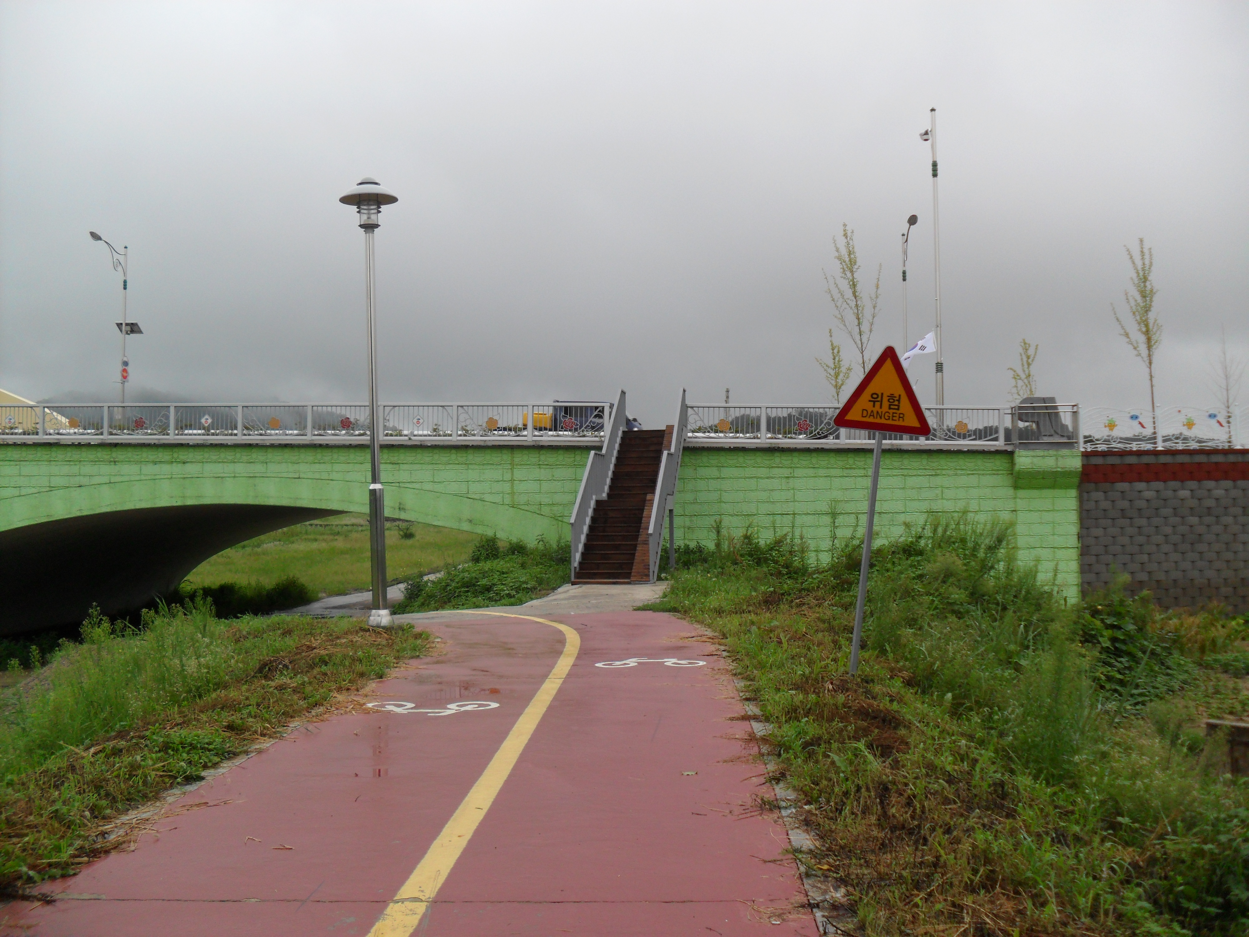 증평군은 보강천 생태하천공원에 대한 접근성을 개선하고 자전거도로 이용자의 편의 및 안전을 증진시키기 위해 장미대교에 보행자용 계단을 설치했다. [증평포토포커스 참조]