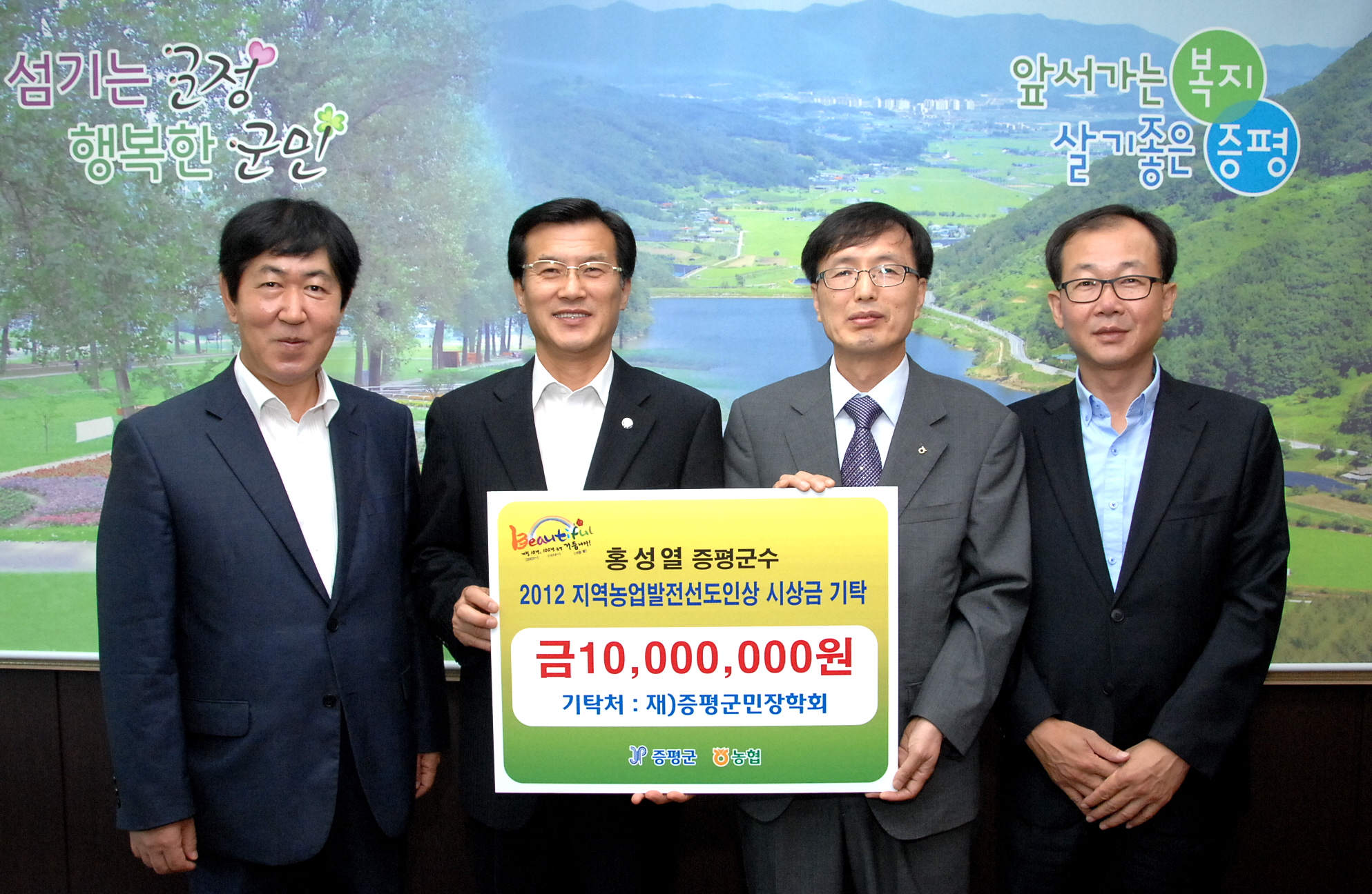 지난 9월 6일 지역농업발전에 기여한 공로로 2012년 지역농업발전 선도인상을 수상한 홍성열 증평군수가 농협중앙회로부터 시상금으로 받은 1,000만원을 24일 재단법인 증평군민장학회 장학기금으로 기탁했다. [보도자료실 참조]