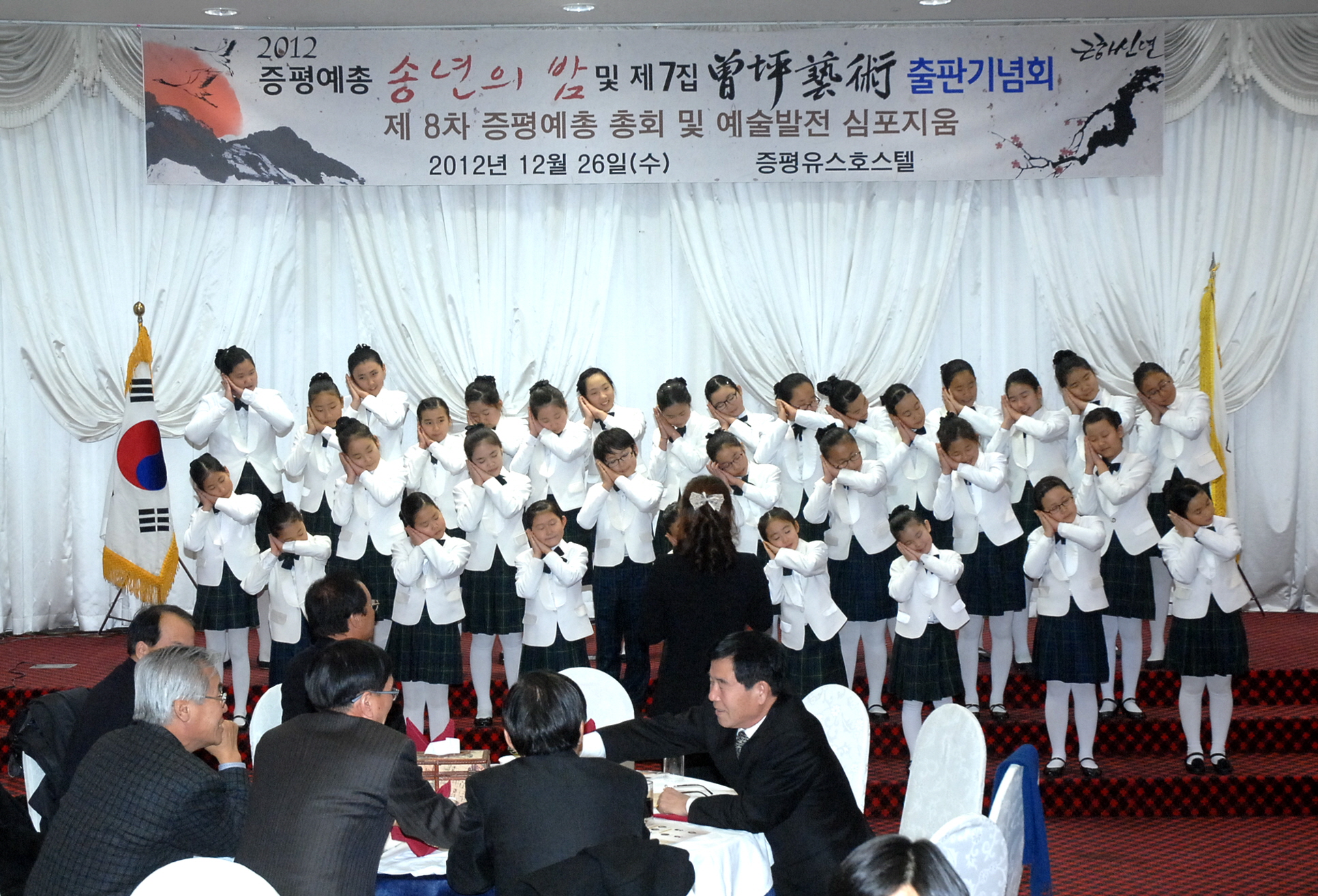 증평예총(회장 김장응)은 지난 26일 오후6시 증평읍 연탄리 증평유스호스텔에서 홍성열군수, 박석규군의장, 김학봉 괴산증평교육장, 김봉회도의원, 문상욱충북도예총회장을 비롯한 기관단체장과 예술인 등 약150여명이 참석한 가운데 2012 증평예총 송년의 밤 및 제7집 증평예술 출판기념회 그리고 제8차 증평예총 총회 및 예술발전 심포지움을 가졌다.