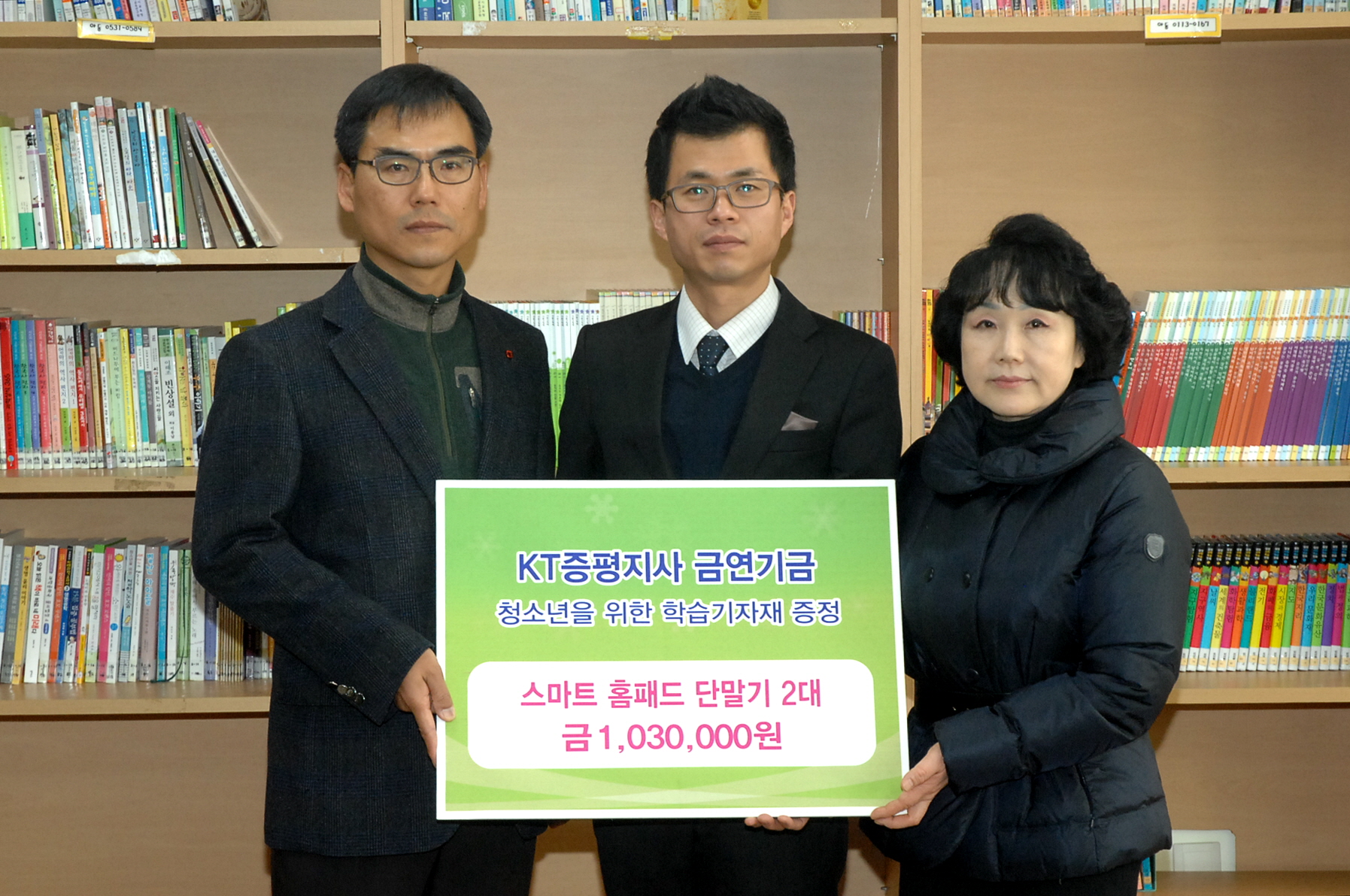 증평군 청소년수련관(관장 강경구)에서는 15일 오후1시30분 KT증평지사(지사장 문현태)가 사내 금연운동을 통해 모은 기금으로 전자학습기기를 ‘방과 후 아카데미’ 교실에 전달하는 행사를 진행했다.
