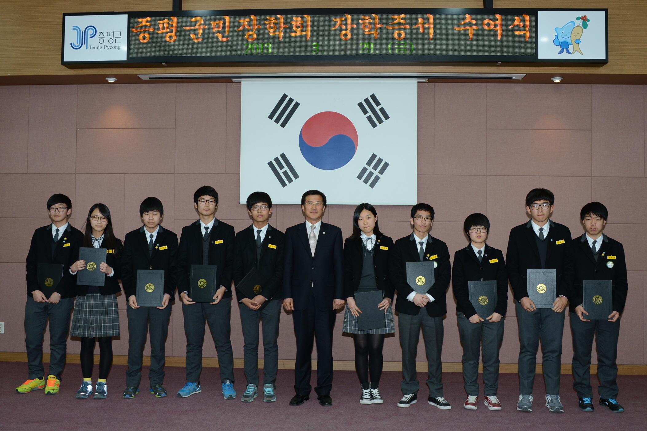 [재]증평군민장학회(이사장 홍성열)는 29일 오후4시 군청 대회의실에서 장학생, 장학회 임원 및 학교 관계자 등 100여명이 참석한 가운데 2013년 지역 내 중·고교 입학성적 우수자 및 우수대학 입학 장학증서 수여식을 갖고 총 67명의 학생에게 8850만원의 장학금을 전달했다. [보도자료실 참조]
