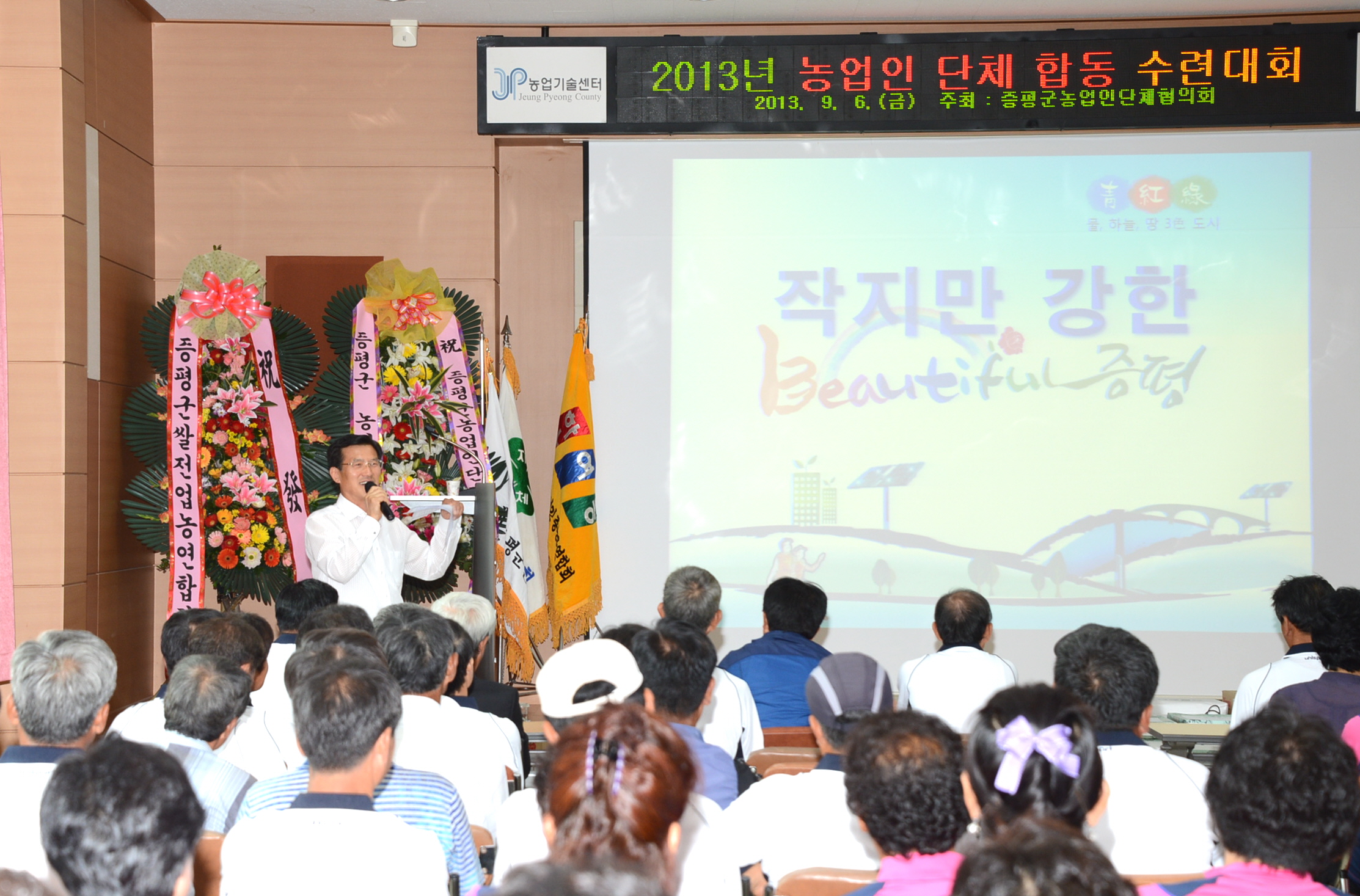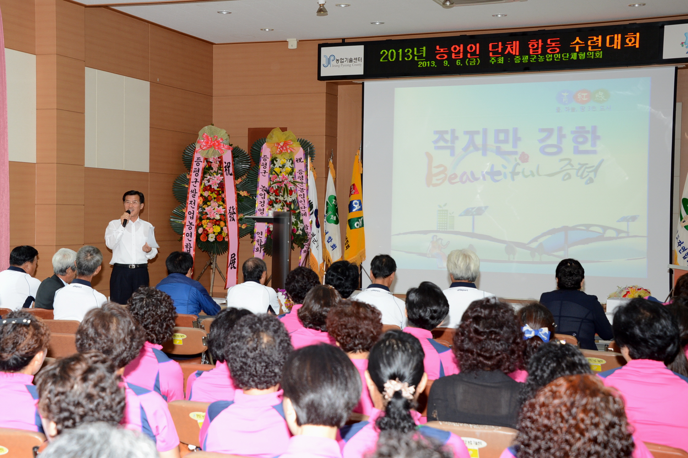증평군농업기술센터(소장 김동구)는 농업인들의 단합과 결속을 다지고 농촌의 활력화를 모색하기 위해 증평군농업인단체(회장: 이채희) 합동수련대회를 6일 오전 11시 농업기술센터 농업인문화관에서 실시했다. [보도자료실 참조]