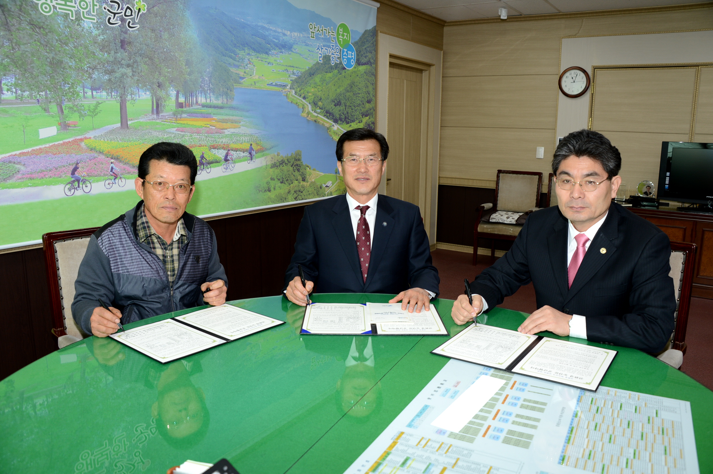 증평군(군수 홍성열)과 괴산증평교육지원청(교육장 이규필), 친환경영농조합법인(대표 양관직)은 친환경농산물 학교급식 지원을 위해 28일 군청 소회의실에서 친환경 학교급식을 위한 ‘친환경농산물 공급 협약 체결식’을 가졌다. [보도자료실 참조]