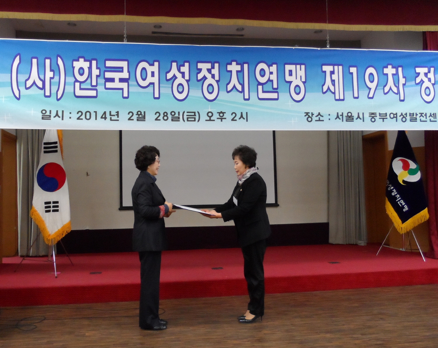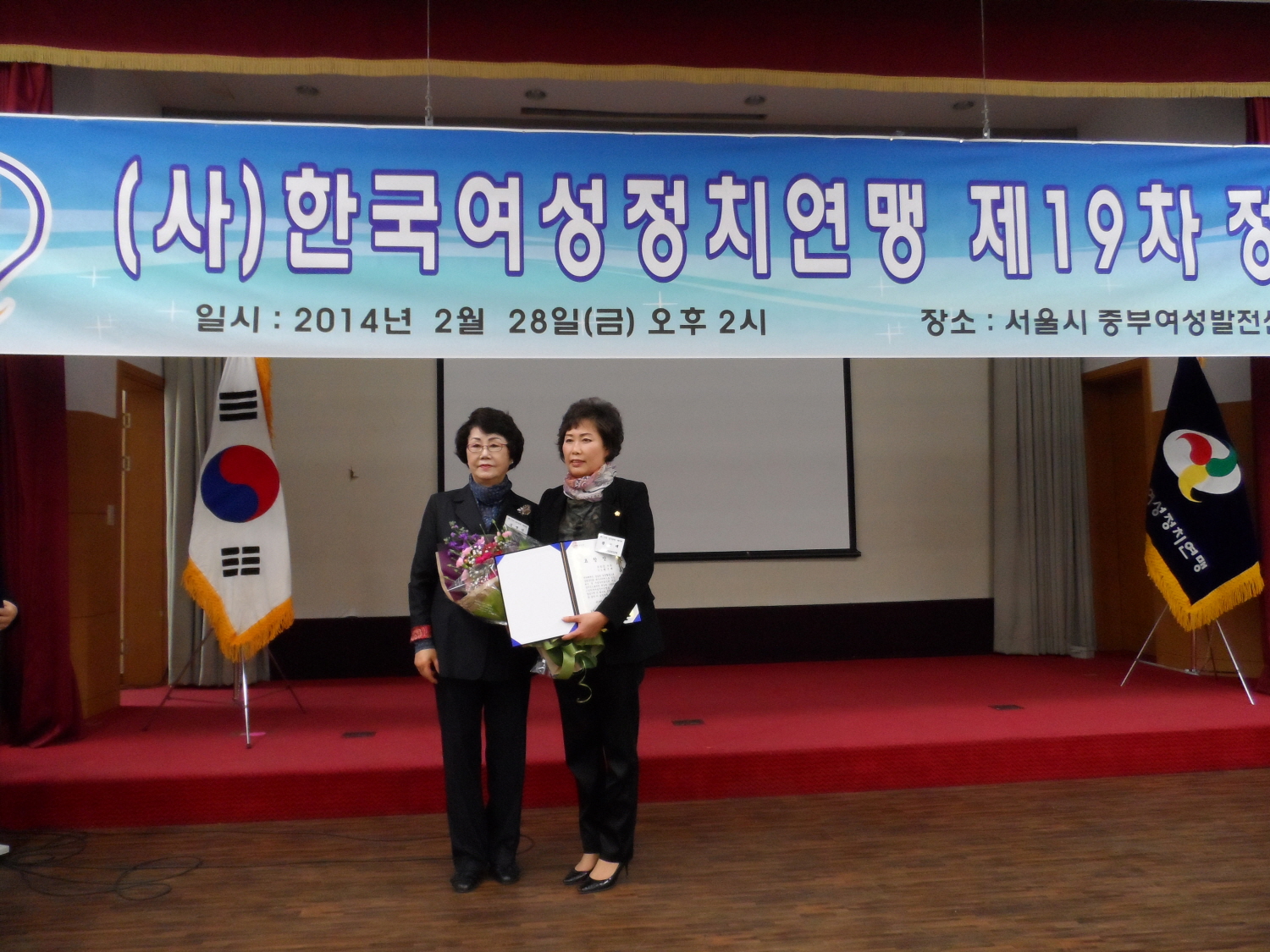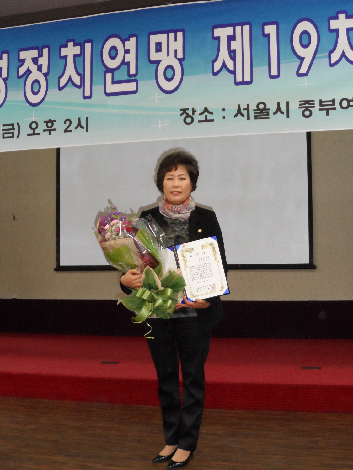 증평군의회 황근례 의원(산업건설위원장. 57세)이 지난달 28일 오후2시 서울 마포구 도화동 서울시 중부여성발전센터에서 열린 (사)한국여성정치연맹(총재 김방림) 제19차 정기총회에서 지방자치 발전과 여성정치인으로서 위상을 높이는데 기여한 공로로 표창장을 수상했다.[보도자료실 참조]