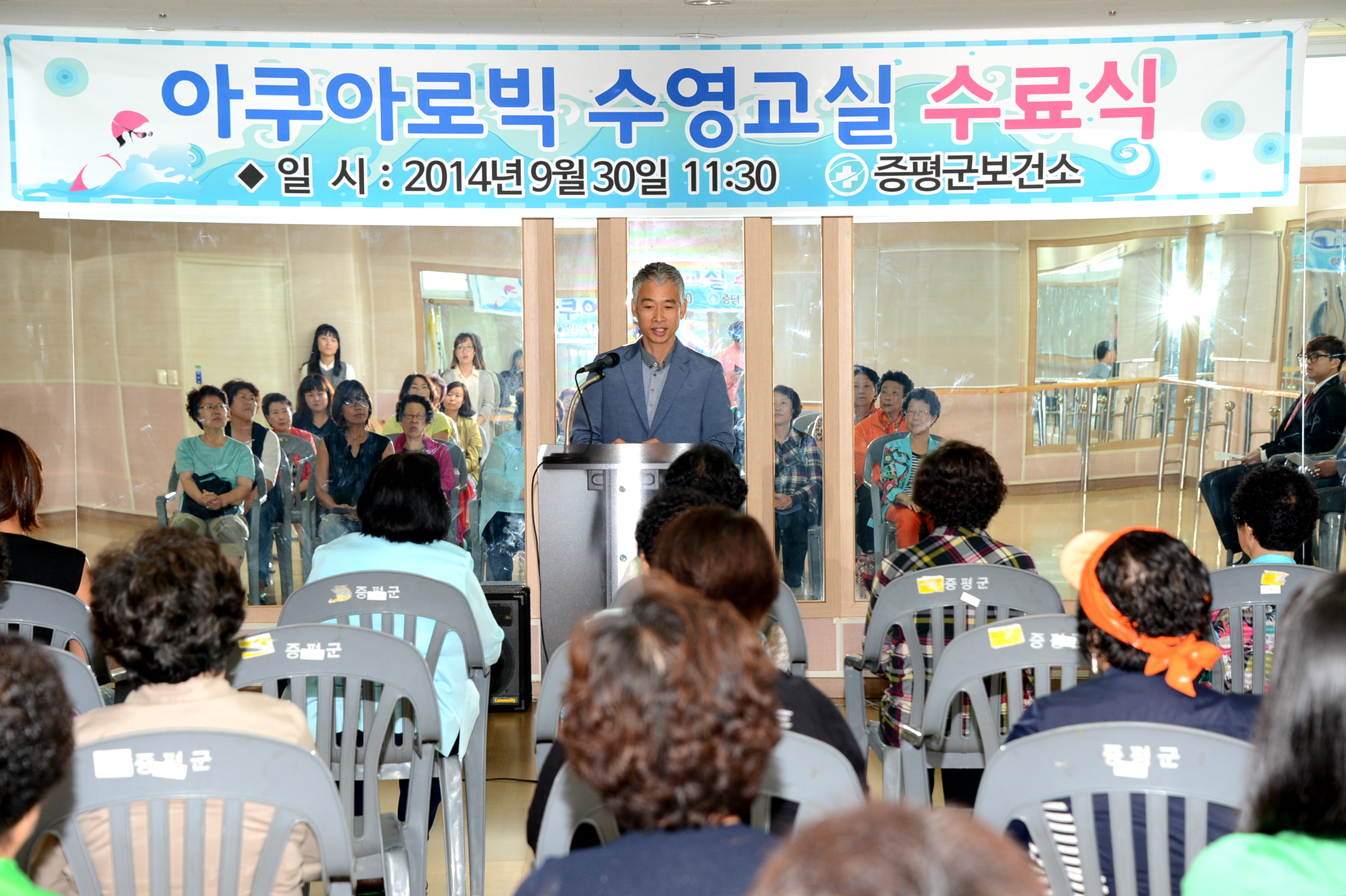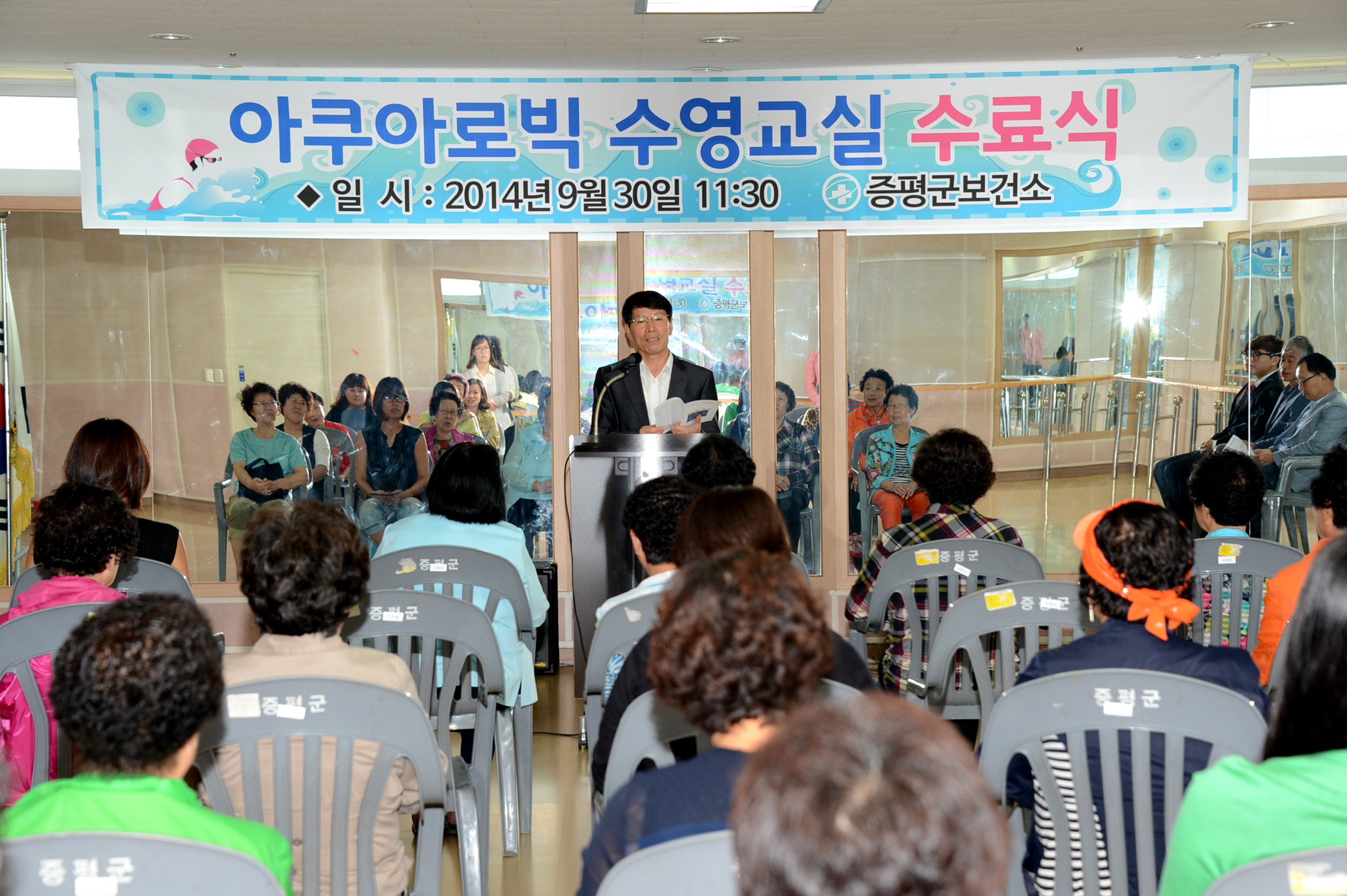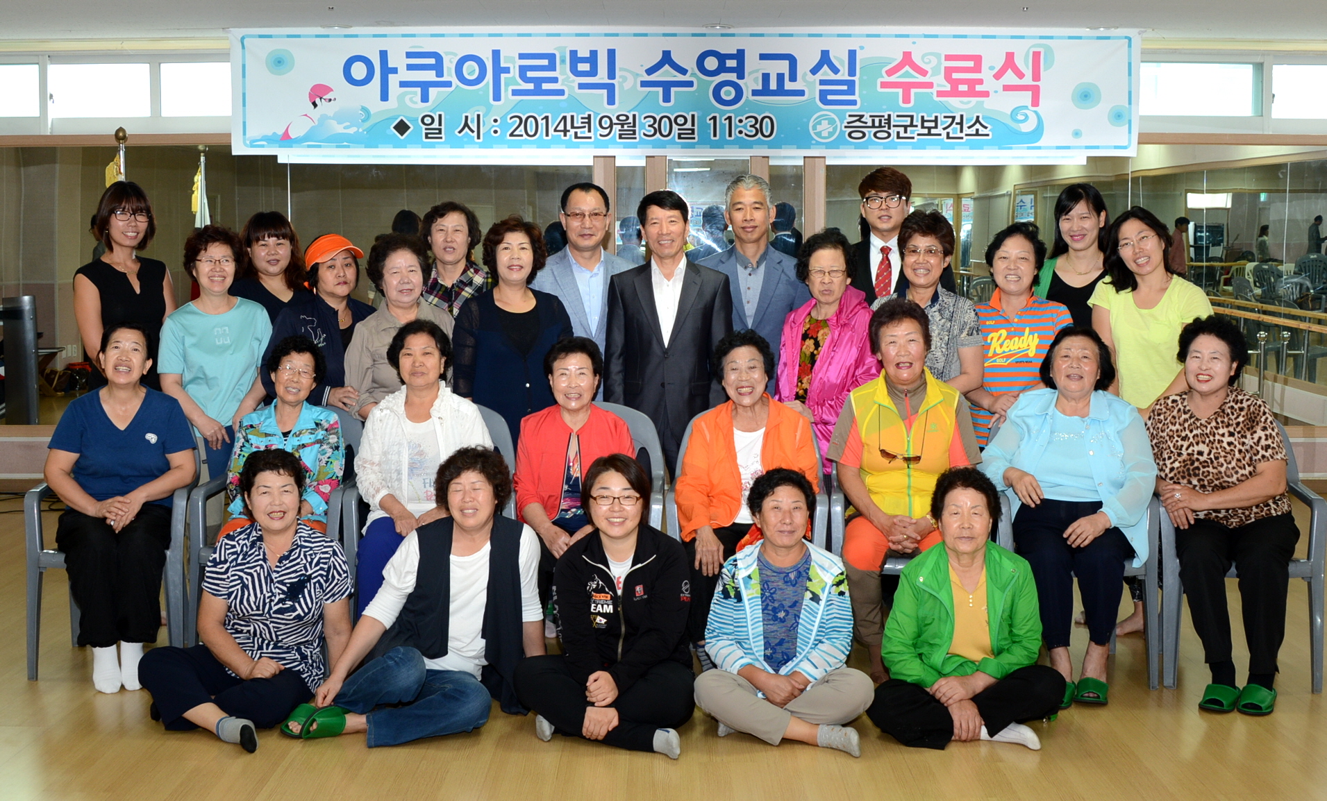 평군보건소(소장 채영수)는 30일 오전 11시30분 증평국민체육센터 2층 댄스실에서 수강자 등 관계자 40여명이 참석한 가운데 아쿠아로빅 수영교실 수료식을 가졌다. [보도자료실 참조]