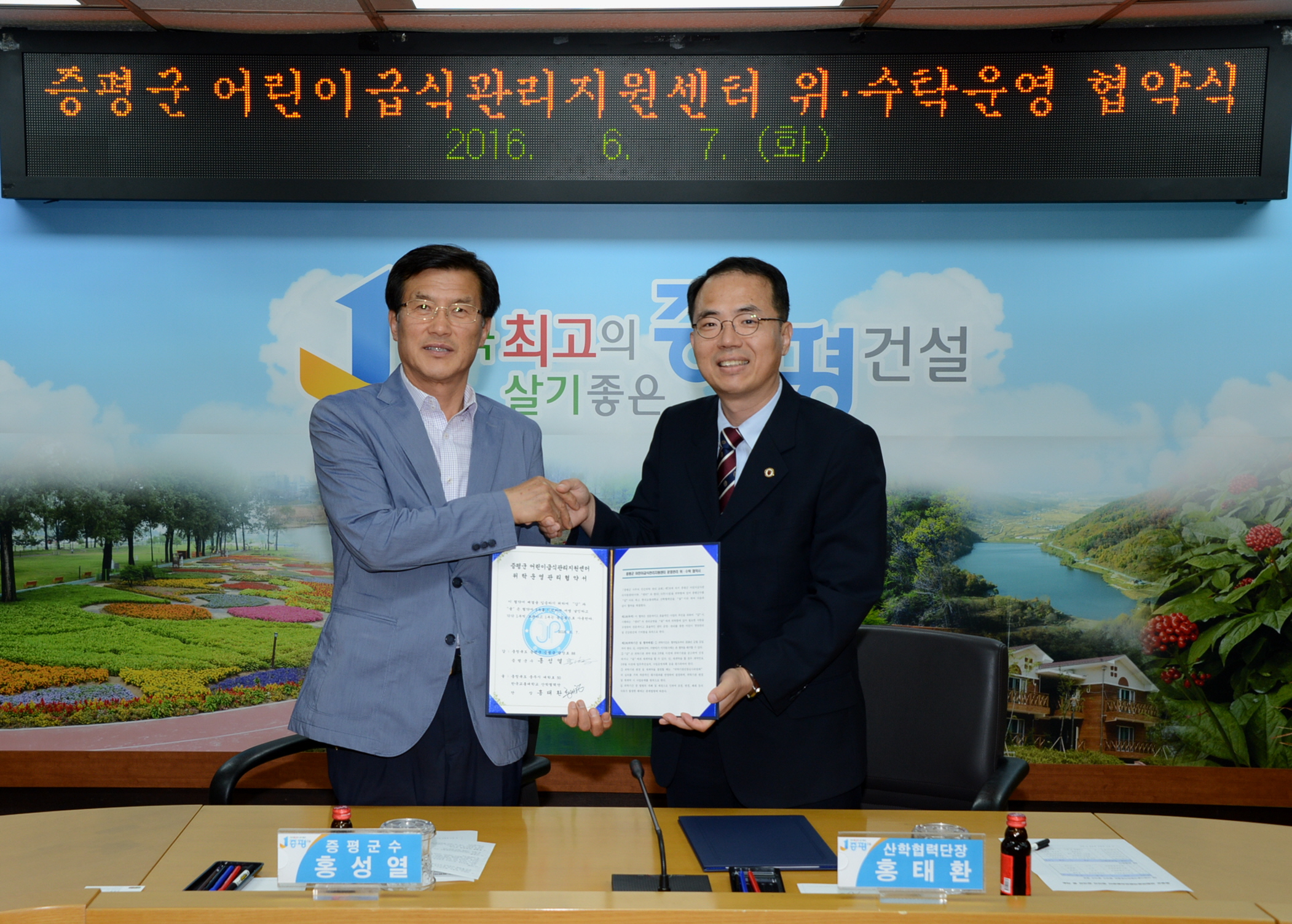 증평군은 7일 오후 5시 군청 소회의실에서 증평군 어린이급식관리지원센터로 선정된 한국교통대학교 산학협력단과 위․수탁 협약을 체결했다.(보도자료실 참조)