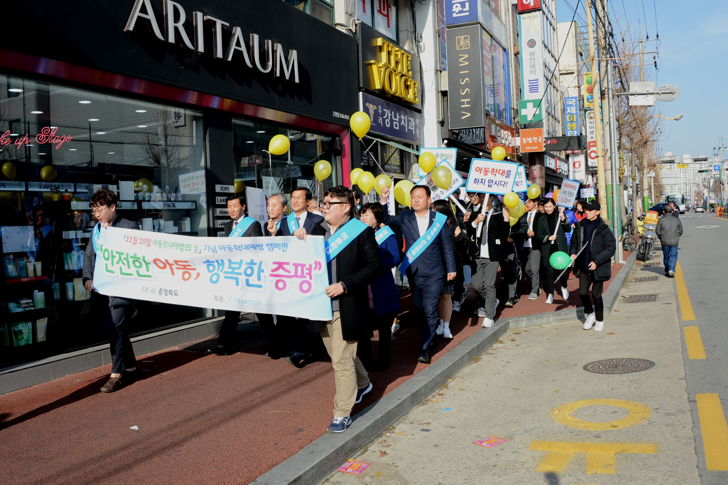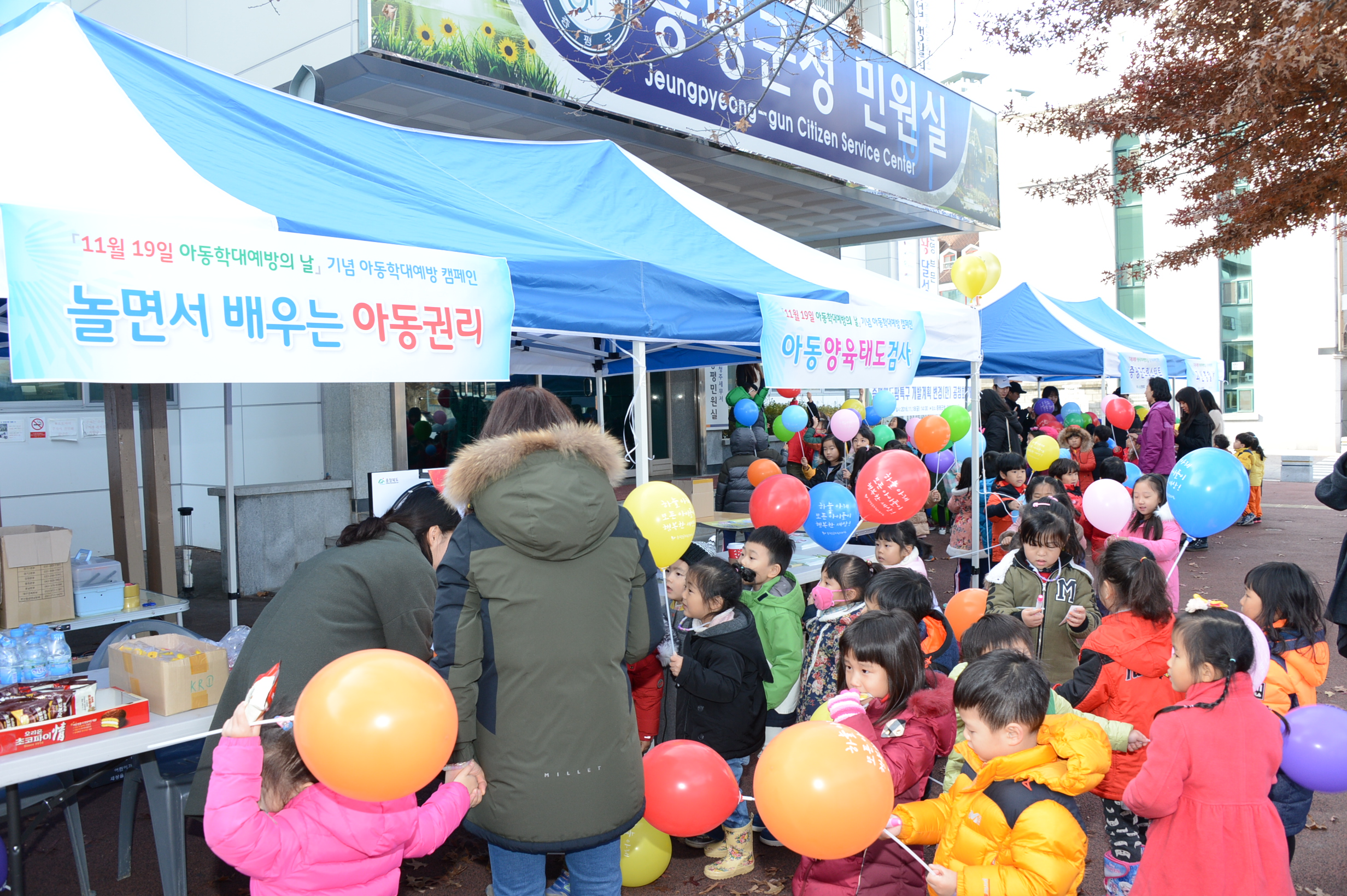 증평군은 아동학대예방의 날(11.19.)과 아동학대예방주간(11.19~11.25.)을 맞아 22일 증평군청 광장 및 민원과 앞에서 충북아동보호전문기관 주관으로 아동학대 예방의 날 캠페인을 개최했다.[보도자료실 참조]