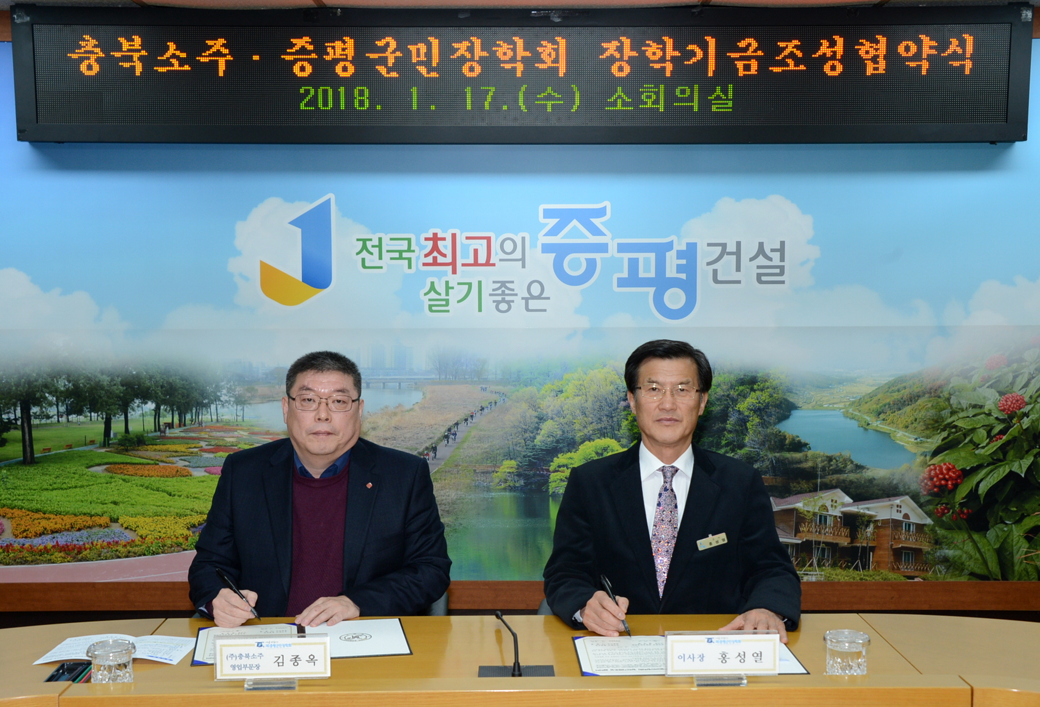 (주)충북소주(대표이사 이종훈)와 (재)증평군민장학회(이사장 홍성열 증평군수)는 10일 군청 2층 소회의실에서 장학기금 조성 협약을 체결하고, 지난해 하반기 소주 판매로 조성한 장학기금 181만9800원을 기탁했다.(보도자료실 참조)