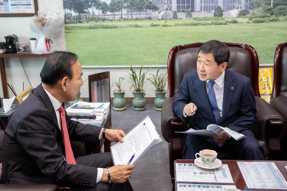이재영 증평군수가 10일 여의도 국회의원 회관에서 박덕흠 국회 농림축산식품해양수산위원을 만나 증평군 농업분야 현안사업을 설명하고 관심과 지원을 요청했다.