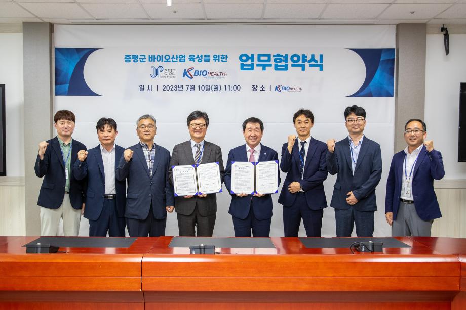 증평군과 오송첨단의료산업진흥재단(KBIOHealth)은 10일 오송첨단의료산업진흥재단 중회의실에서 바이오산업 육성을 위한 업무협약을 체결했다.