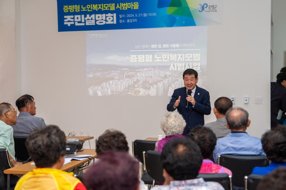 충북 증평군이 27일 증평읍 용강3리(이장 유영창) 주민행복센터에서 증평형 노인복지모델 시범사업 현판식 및 주민설명회를 개최했다.