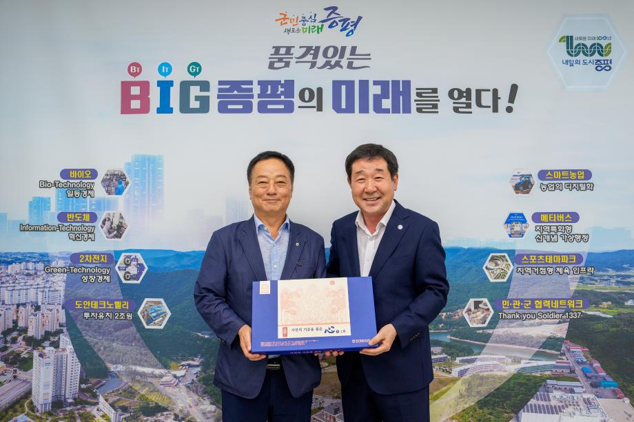 충북 증평군은 19일 풍기인삼농협(조합장 권헌준)이 군청에 방문해 고향사랑 기부금 380만원을 기탁했다고 밝혔다.