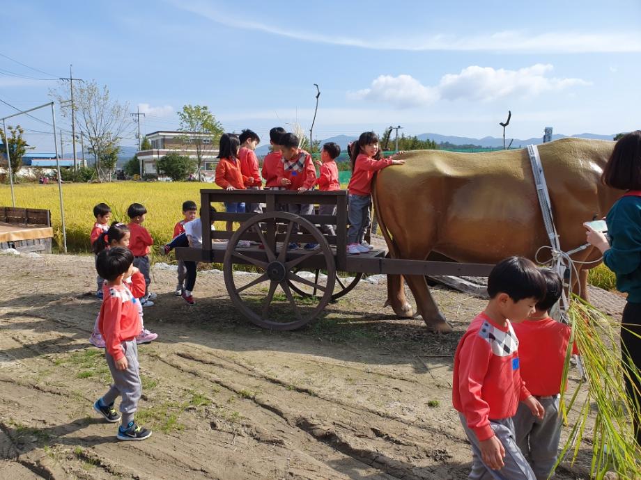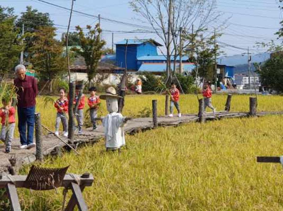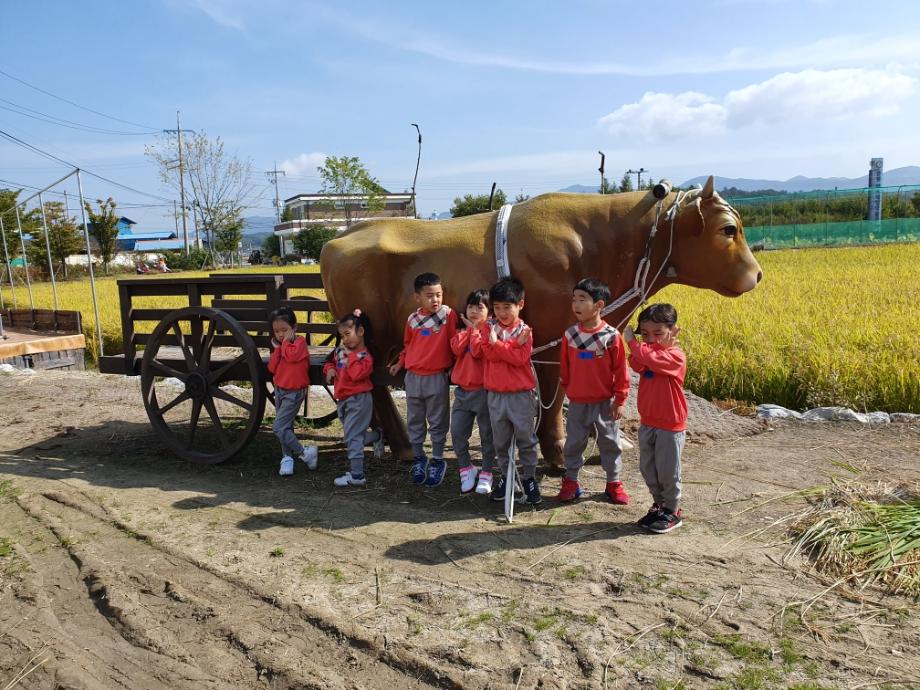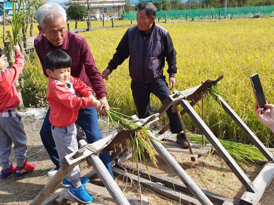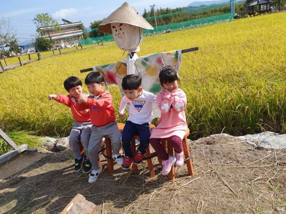 삼보어린이집에서 벼수확 체험 나들이를 나왔네요. 지금은 기계로 벼를 대량으로 털지만 과거에는 일일이 사람의 손을 거쳐서 털었던 모습을 체험하면서 허수아비랑 멋진 추억도 만들었네요.
