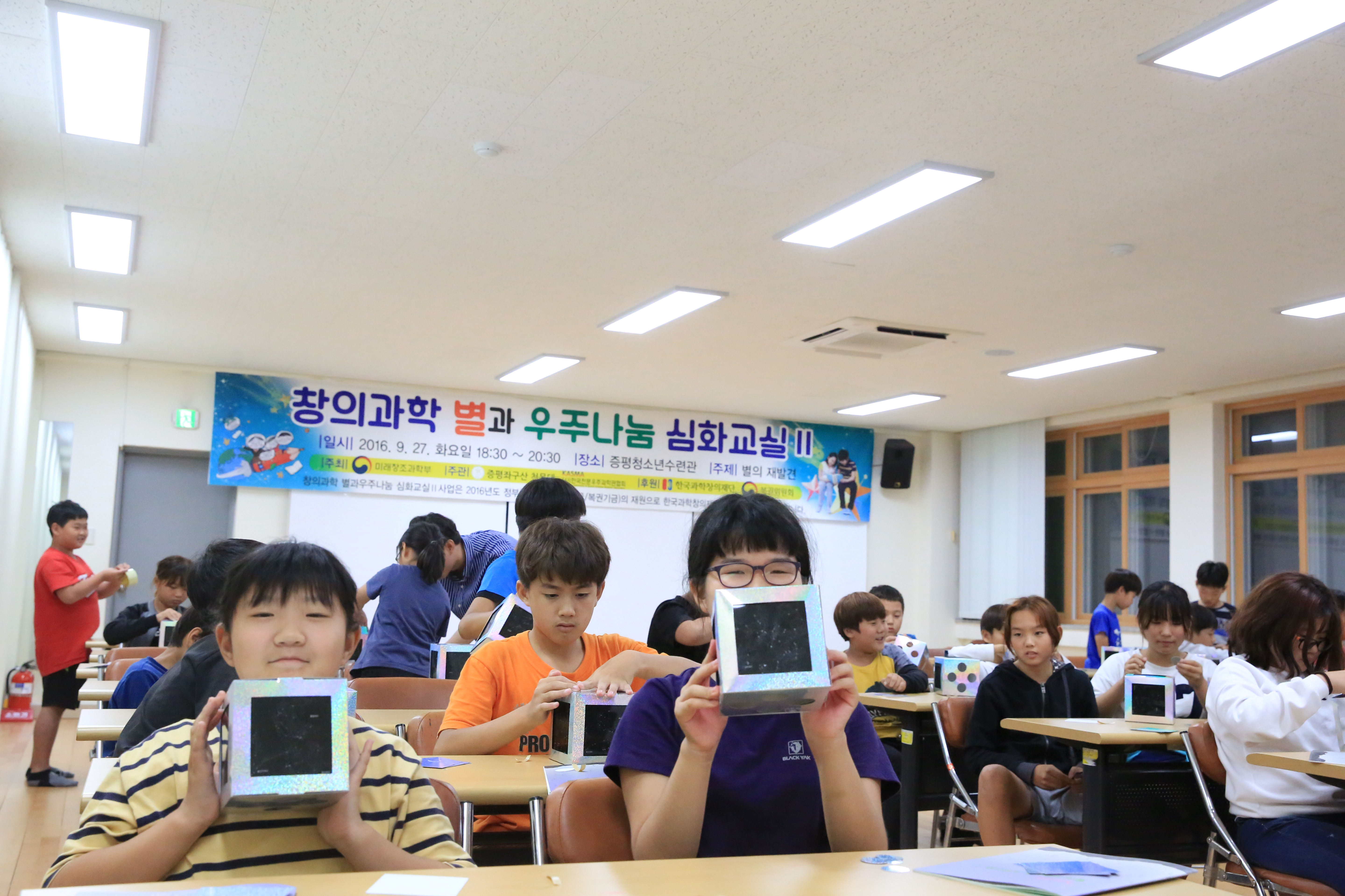 지난 27일 증평군청소년수련관에서는 (사)한국천문우주과학관협회와 증평좌구산천문대가 주관하고, 2016년도 정부(과학기술진흥기금/복권기금)의 재원으로 한국과학창의재단과 복권위원회의 후원을 받아서 진행된 "2016 창의과학 별과 우주나눔 심화교실Ⅱ" 수업이 있었습니다.